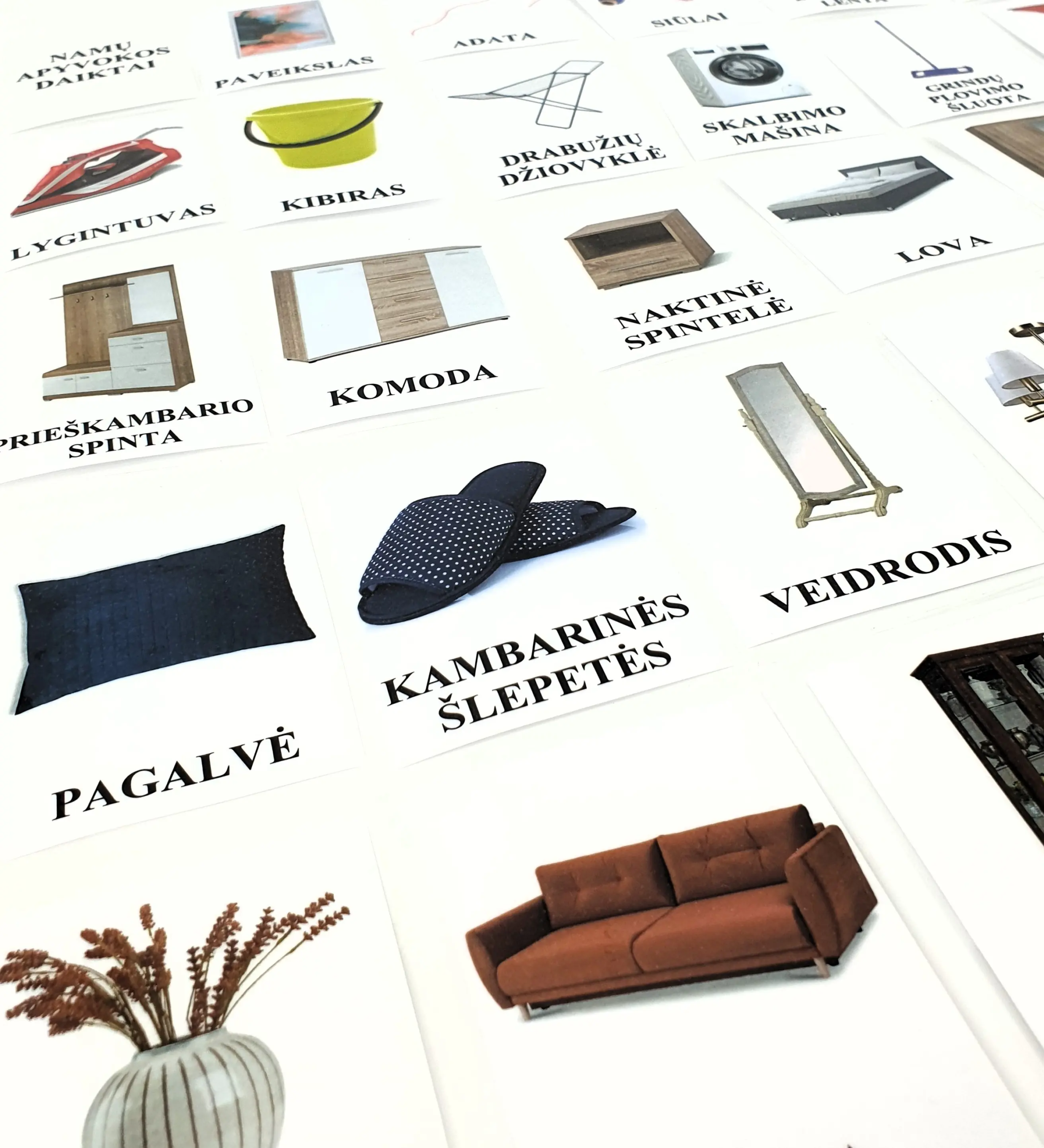 Lavinamoji kalbos ugdymo (logopedinė) priemonė –kortelės su namų apyvokos daiktais ir objektais, kuriuos dažniausiai sutinkame svetainėje, miegamajame ir prieškambaryje. Korteles galima naudoti įvairiais būdais: pavyzdžiui, rodyti ir prašyti įvardyti, kas tai, rodyti kortelę ir ieškoti to objekto namuose. Kortelės yra laminuotos, skirtos naudoti prižiūrint suaugusiesiems.